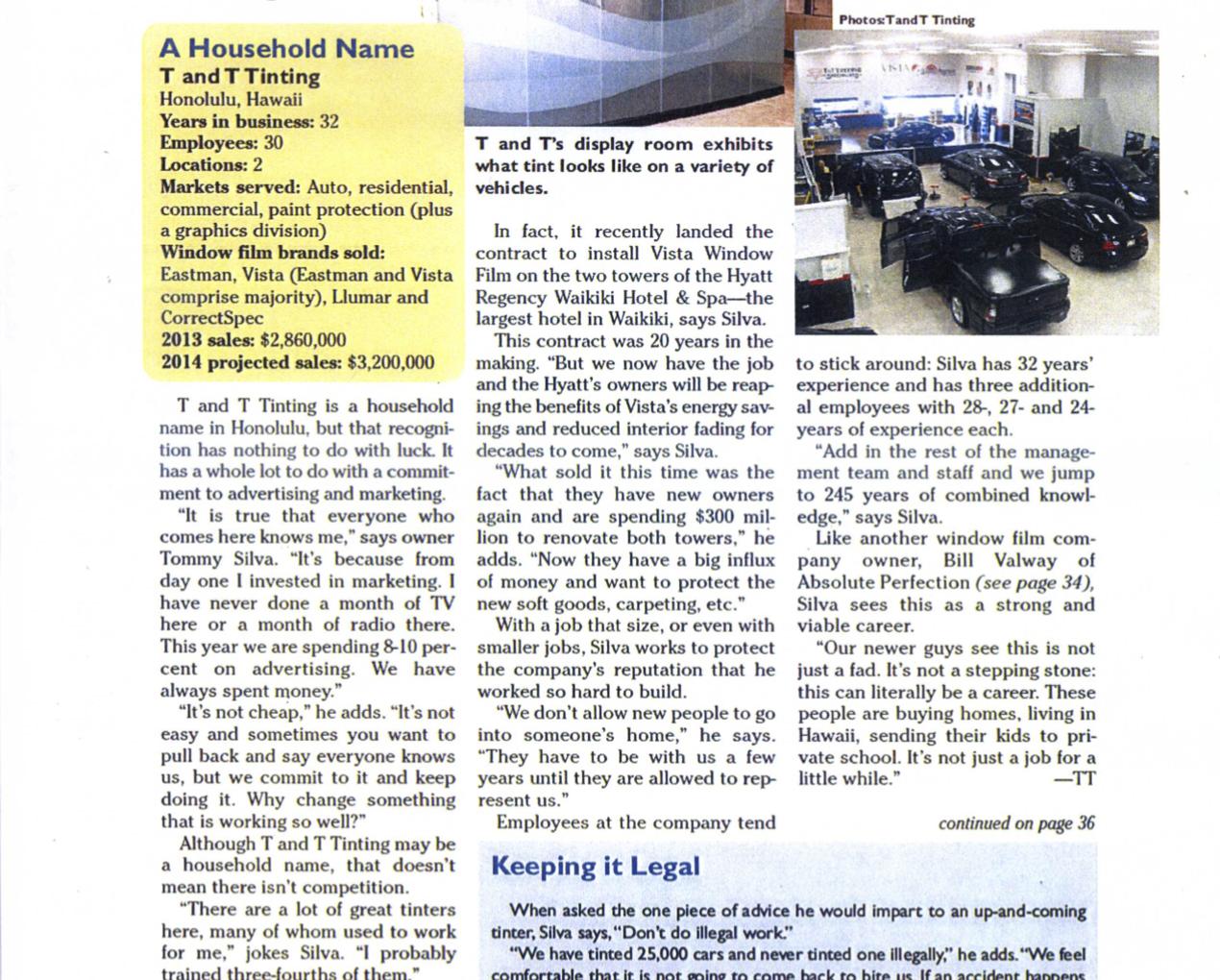 Since 1982, T&T Tinting has been Hawaii's leader in professional window tinting installation and is the ONLY Glass Tinting Company in the State of Hawaii that is also ranked as one of the TOP Window Tint Installation Companies in the United States .