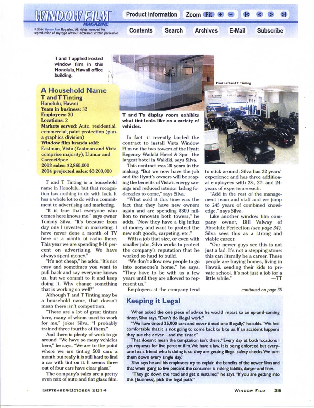 Since 1982, T&T Tinting has been Hawaii's leader in professional window tinting installation and is the ONLY Glass Tinting Company in the State of Hawaii that is also ranked as one of the TOP Window Tint Installation Companies in the United States .