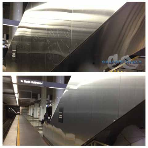 "You need Metal-Shield if you have graffiti damage or oxidation as pictured above happening to your Stainless Steel or Brass Elevator panels, escalator panels, etc.. This new product masks and hides graffiti, high traffic damage and unsightly oxidation while bringing back the original brushed stainless or brushed bronze appearance. Does not require buffing out damage prior to installation. Saves you time and money!"