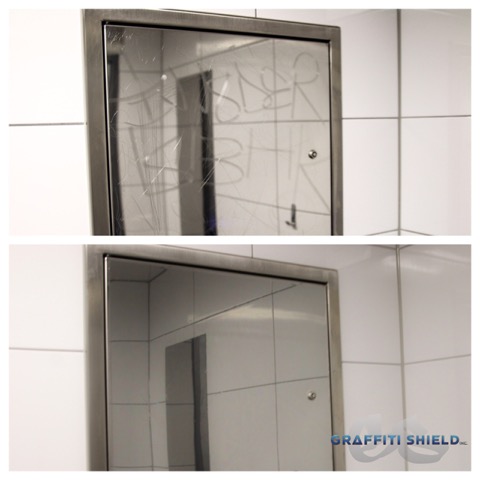 Mirror Shield offers the reflective look of a mirror, while providing protection to the surface underneath. When a mirror is then re-vandalized it will only be the protective film that’s destroyed, not the mirror. Mirror Shield is also a green alternative to replacing the actual mirror. Instead of throwing the mirror away and having it sit in a landfill, you’re simply covering the surface to make it “like new” again. Like our other products it is acid resistant and it also uses the same adhesive so that it can’t be pulled off by the general public, but by a trained technician without leaving any adhesive residue behind.